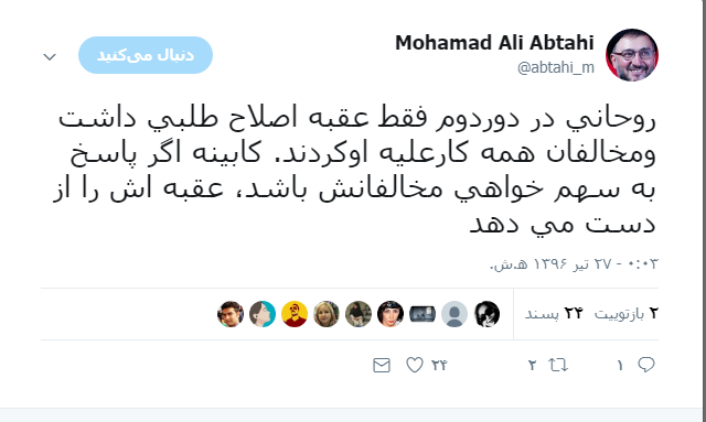 به گزارش جماران، محمد علی ابطحی توئیت کرد: روحانی در دور دوم فقط عقبه اصلاح طلبی داشت و مخالفان همه کار علیه او کردند. کابینه اگر پاسخ به سهم خواهی مخالفانش باشد، عقبه اش را از دست می دهد.