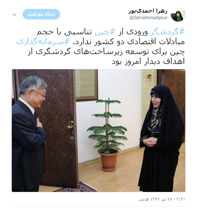 به گزارش جماران زهرا احمدی پور توئیت کرد:  ورودی از تناسبی با حجم مبادلات اقتصادی دو کشور ندارد. چین برای توسعه زیرساخت‌های گردشگری از اهداف دیدار امروز بود.