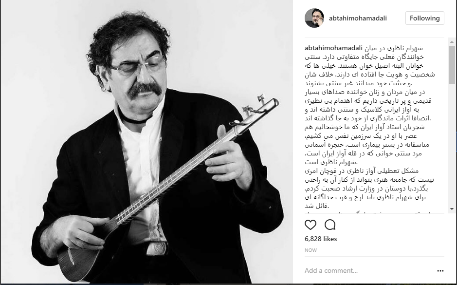 شجریان استاد آواز ایران که ما خوشحالیم هم عصر با او در یک سرزمین نفس می کشیم، متاسفانه در بستر بیماری است. حنجره آسمانی مرد سنتی خوانی که در قله آواز ایران است، شهرام ناظری است.