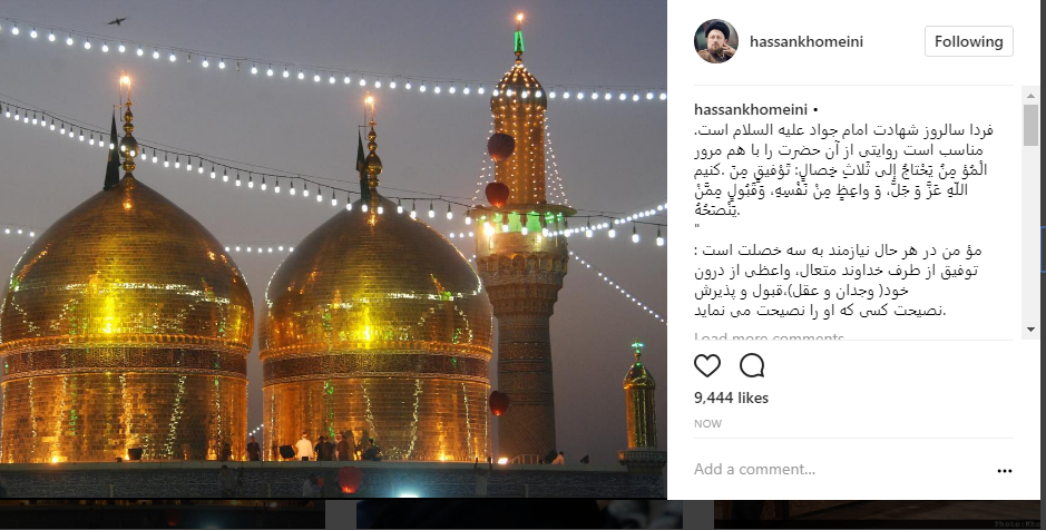 به گزارش جماران سید حسن خمینی در صفحه اینستاگرام خود نوشت: فردا سالروز شهادت امام جواد علیه السلام است. مناسب است روایتى از آن حضرت را با هم مرور کنیم. الْمُؤ مِنُ یَحْتاجُ إلى ثَلاثِ خِصالٍ: تَوْفیقٍ مِنَ اللّهِ عَزَّ وَ جَلَّ، وَ واعِظٍ مِنْ نَفْسِهِ، وَقَبُولٍ مِمَّنْ یَنْصَحُهُ