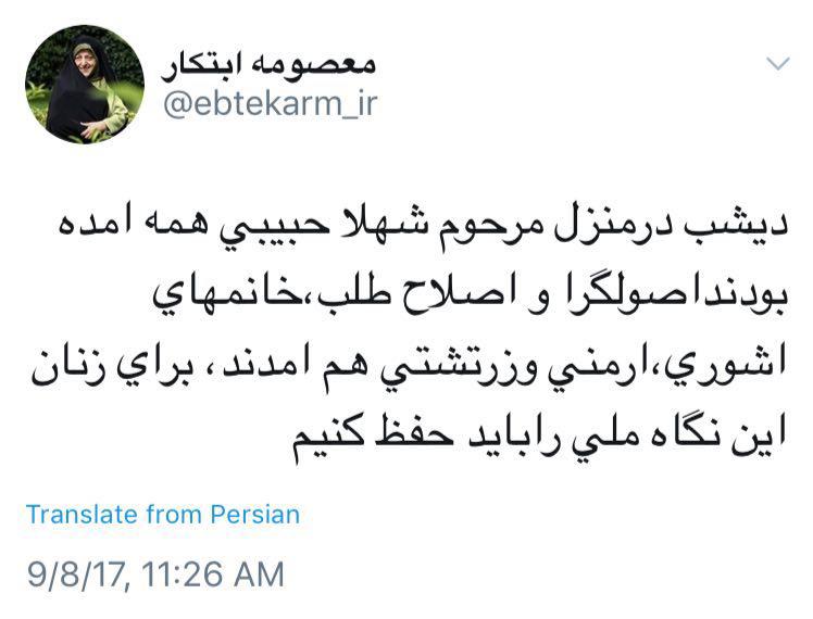 به گزارش جماران؛ معاون امور زنان ریاست جمهوری در توییتی نوشت: «دیشب در منزل مرحوم شهلا حبیبی همه آمده بودند اصولگرا و اصلاح طلب، خانمهای اشوری، ارمنی و زرتشتی هم آمدند، برای زنان این نگاه ملی را باید حفظ کنیم.»