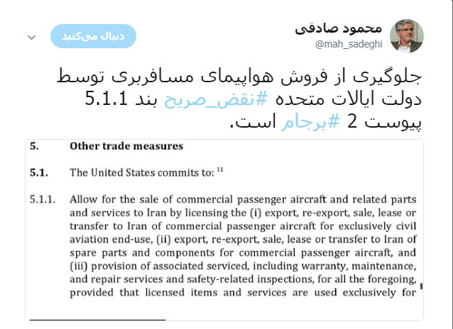 به گزارش جماران، محمود صادقی در توئیتر خود نوشت: جلوگیری از فروش هواپیمای مسافربری توسط دولت ایالات متحده #نقض_صریح بند 5.1.1 پیوست 2 #برجام است.