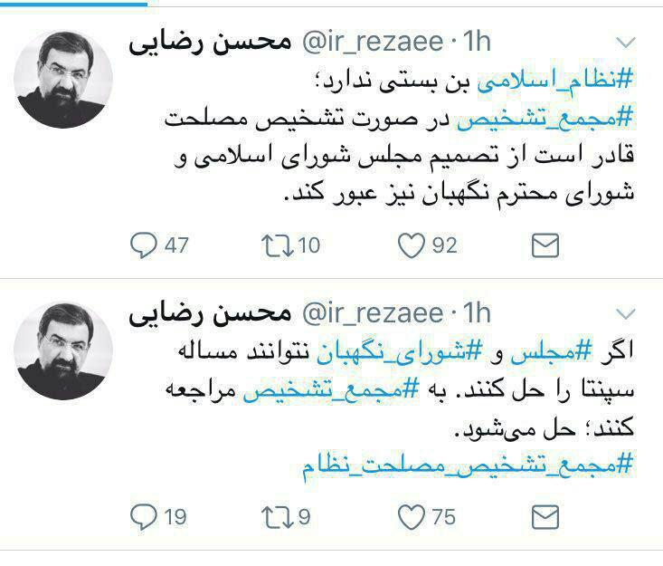 به گزارش جماران محسن رضایی در حساب توییتری خود نوشت: اگر مجلس و شورای نگهبان نتوانند مساله سپنتا را حل کنند به مجمع تشخیص مراجعه کنند حل می شود.