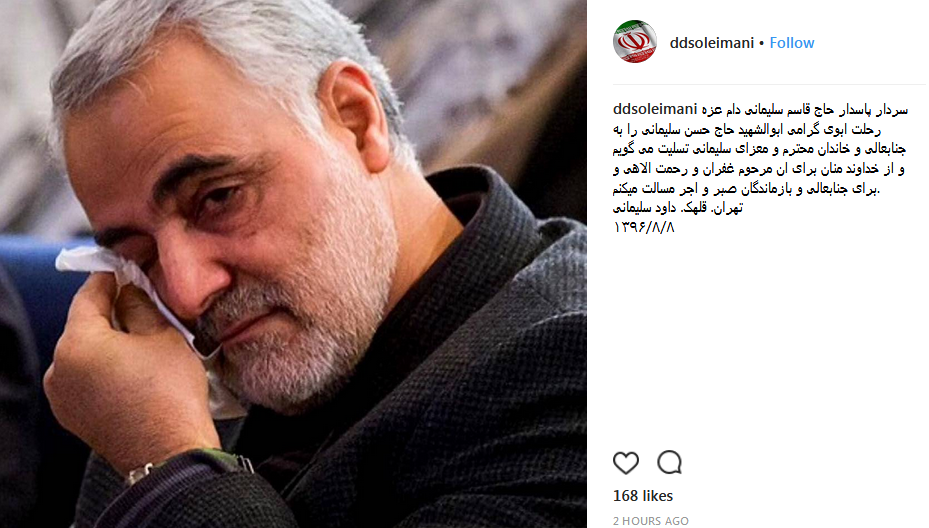 رحلت ابوی گرامی ابوالشهید حاج حسن سلیمانی را به جنابعالی و خاندان محترم و معزای سلیمانی تسلیت می گویم و از خداوند منان برای ان مرحوم غفران و رحمت الاهی و برای جنابعالی و بازماندگان صبر و اجر مسالت میکنم.