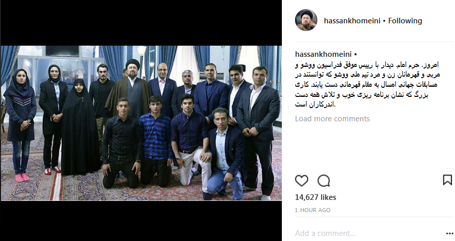امروز. حرم امام. دیدار با رییس موفق فدراسیون ووشو و مربى و قهرمانان زن و مرد تیم ملى ووشو که توانستند در مسابقات جهانى امسال به مقام قهرمانى دست یابند. کارى بزرگ که نشان برنامه ریزى خوب و تلاش همه دست اندرکاران است.