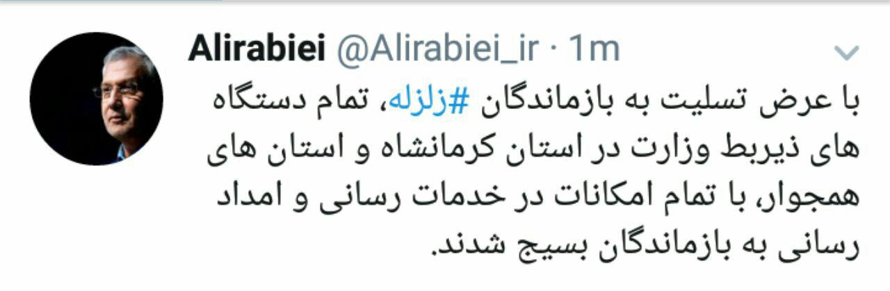 با عرض تسلیت به بازماندگان زلزله، تمام دستگاه های ذیربط وزارت در استان کرمانشاه و استان های همجوار، با تمام امکانات در خدمات رسانی و امداد رسانی به بازماندگان بسیج شدند.