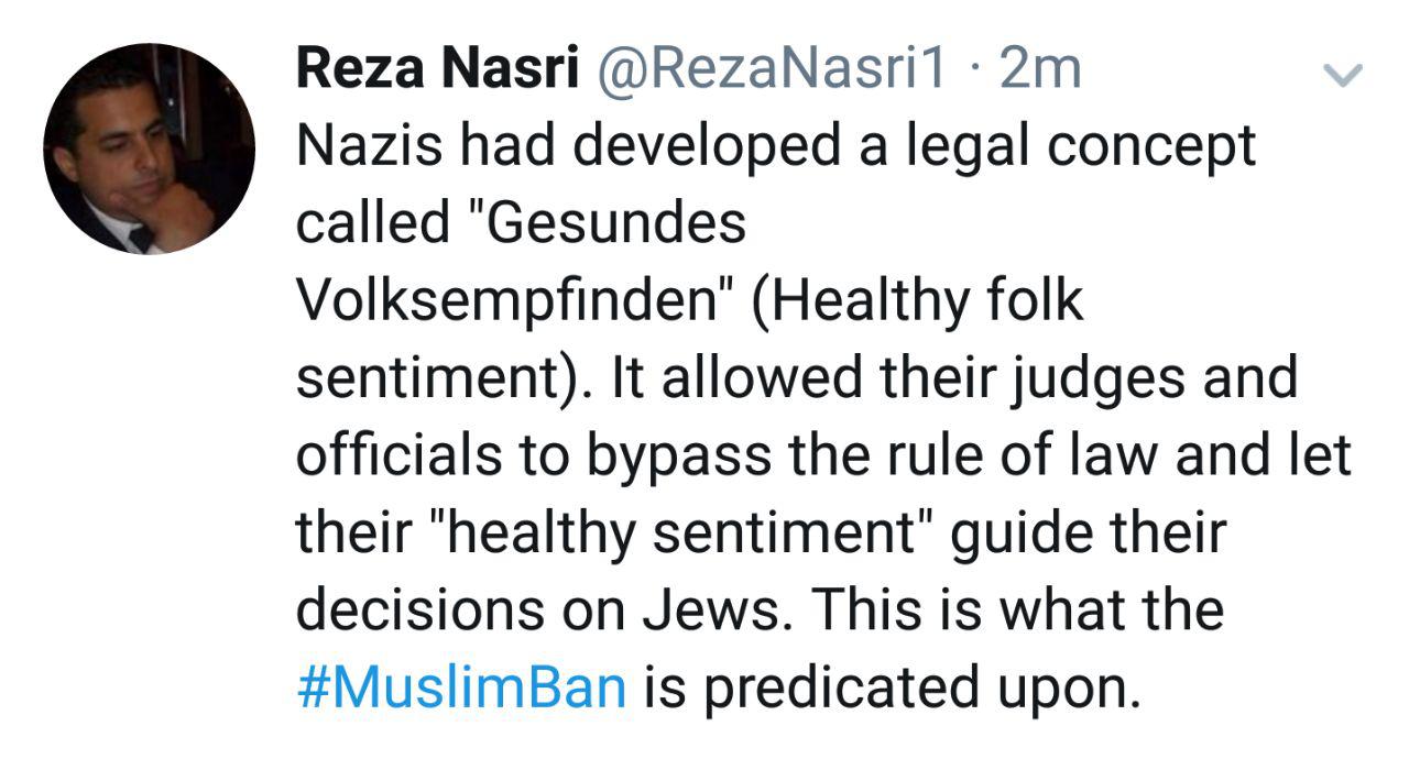 نازیها یک مقوله حقوقی تحت عنوان «حس سالم مردمی» اختراع کرده بودند که به قضات و مقامات دولتیشان اجازه میداد تا در مورد یهودیان «حاکمیت قانون» را کنار بگذارند و مطابق این «حس سالم» تصمیم بگیرند. مبنا و اساس قانون «منع مسلمانان» هم همین مقوله است!