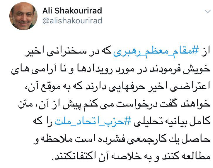 علی شکوری راد از رهبر معظم انقلاب درخواست کرد تا متن کامل بیانیه تحلیلى حزب اتحاد ملت را ملاحظه و مطالعه کنند