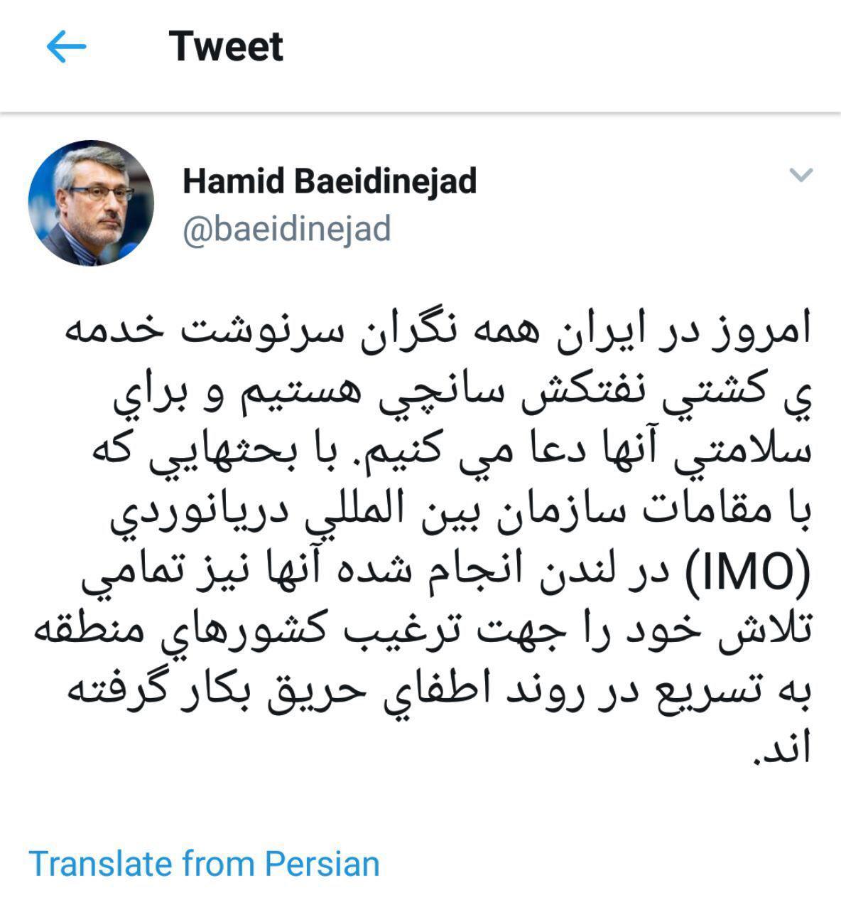 به گزارش جماران؛ حمید بعیدی نژاد در پیامی توییتری نوشت: با بحثهایی که با مقامات سازمان بین المللی دریانوردی (IMO) در لندن انجام شده آنها نیز تلاش خود را جهت ترغیب کشورهای منطقه به تسریع در روند اطفای حریق نفتکش سانچی به کار گرفتهاند.