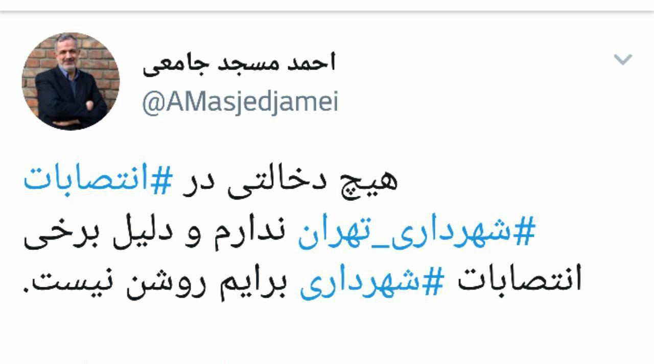 به گزارش جماران؛ احمد مسجد جامعی در توئیتی نوشت: «هیچ دخالتی در انتصابات شهرداری تهران ندارم و دلیل برخی انتصابات شهردارى برایم روشن نیست».