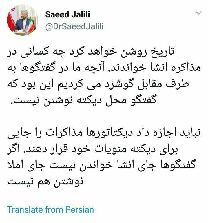 «تاریخ روشن خواهد کرد چه کسانی در مذاکره انشا خواندند. آنچه ما در گفتگوها به طرف مقابل گوشزد می کردیم این بود که گفتگو محل دیکته نوشتن نیست. نباید اجازه داد دیکتاتورها مذاکرات را جایی برای دیکته منویات خود قرار دهند. اگر گفتگوها جای انشا خواندن نیست جای املا نوشتن هم نیست.»
