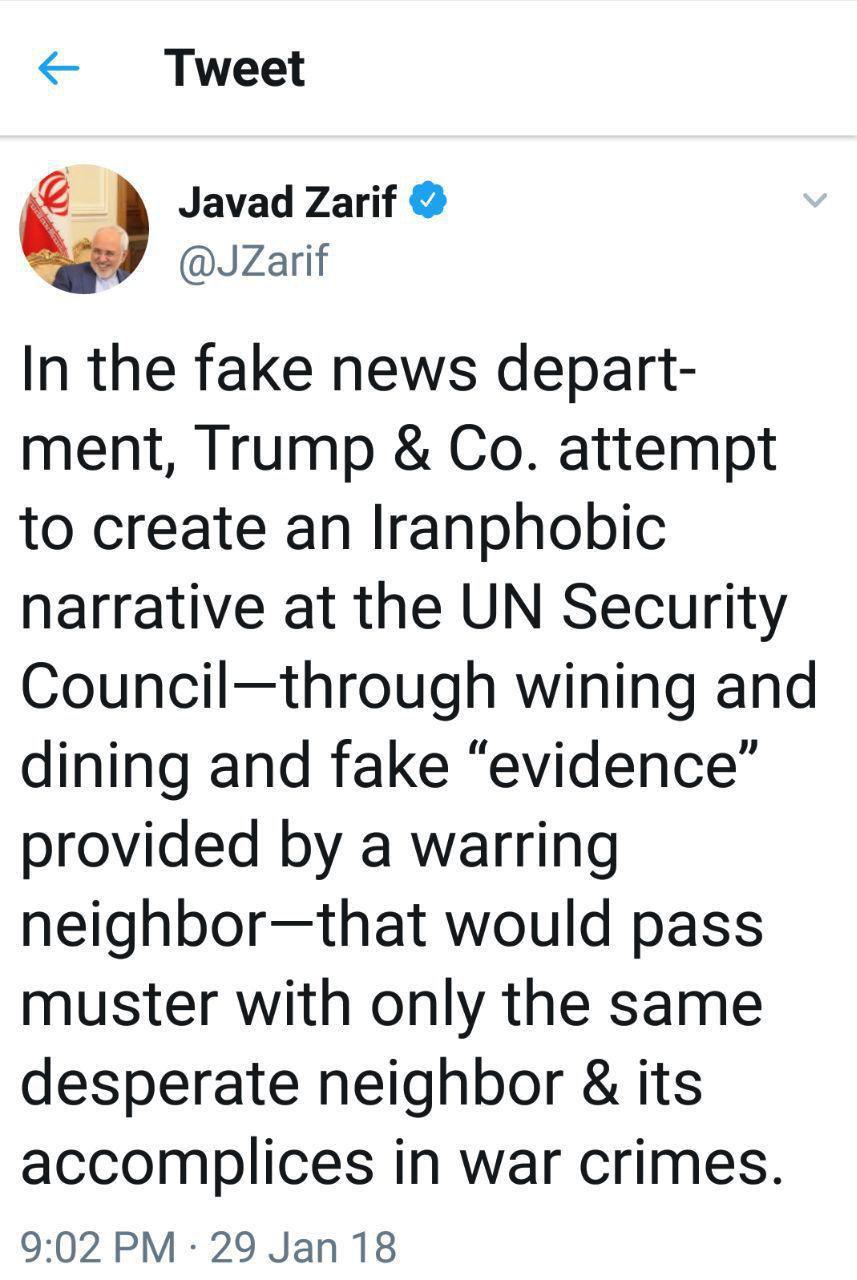 «در بخش خبرهای قلابی، ترامپ و همدستانش تلاش می کنند روایتی ایران هراسانه در شورای امنیت سازمان ملل متحد ایجاد کنند آن هم از طریق برگزاری ضیافت و ارائه مدارک تقلبی که توسط یک همسایه در حال جنگ تولید شده و تنها برای همان همسایه مستاصل و همدستانش در ارتکاب جنایات جنگی قابل باور است.»