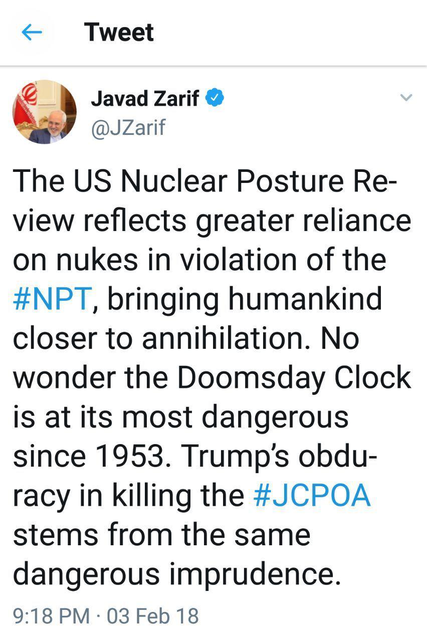 مرور سیاست هسته‌ای آمریکا نشان‌دهنده اتکای بیشتر آمریکا بر سلاح‌های هسته‌ای است که نقض معاهده NPT است و انسانیت را به نابودی هسته‌ای نزدیک‌تر می کند.