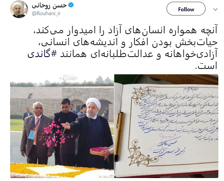 به گزارش جماران؛ در صفحه توییتر حسن روحانی رئیس جمهوری آمده است: «آنچه همواره انسان‌های آزاد را امیدوار می‌کند، حیات‌بخش بودن افکار و اندیشه‌های انسانی، آزادی‌خواهانه و عدالت‌طلبانه‌ای همانند گاندی است.»