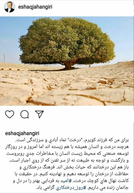 به گزارش جماران، اسحاق جهانگیری معاون اول رئیسجمهوری در صفحه شخصی خود در اینستاگرام، با اشاره به فرا رسیدن روز درختکاری-۱۵اسفند- نوشت: