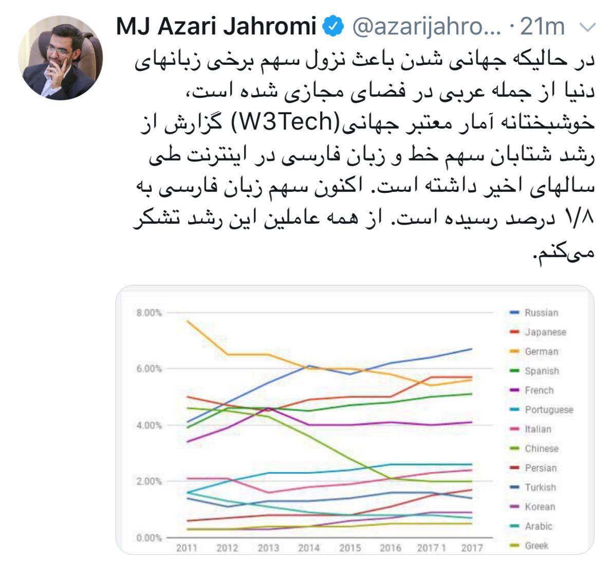 به گزارش جماران؛ محمدجواد آذری جهرمی وزیر ارتباطات امروز در صفحه توییترش نوشت: «در حالیکه جهانی شدن باعث نزول سهم برخی زبانهای دنیا از جمله عربی در فضای مجازی شده است، خوشبختانه آمار معتبر جهانی (W3Tech) گزارش از رشد شتابان سهم خط و زبان فارسی در اینترنت طی سالهای اخیر داشته است. اکنون سهم زبان فارسی به 1.8 درصد رسیده است. از همه عاملین این رشد تشکر می کنم».