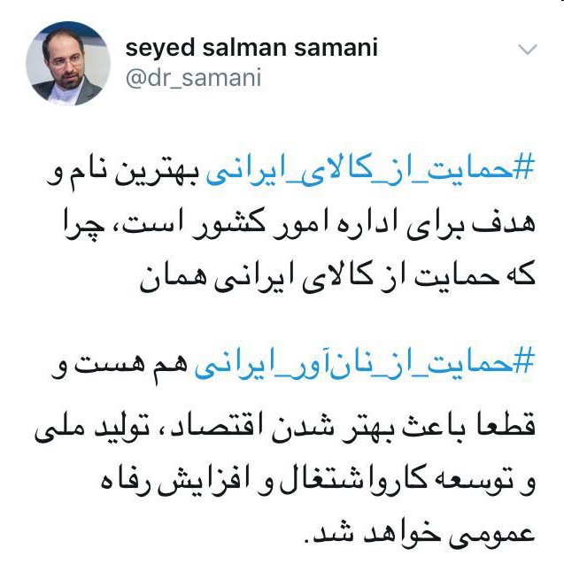 «حمایت از کالای ایرانی بهترین نام و هدف برای اداره امور کشور است چرا که حمایت از کالای ایرانی همان حمایت از نان آور ایرانی هم هست و قطعا باعث بهتر شدن اقتصاد، تولید ملی و توسعه کار و اشتغال و افزایش رفاه عمومی خواهد شد».