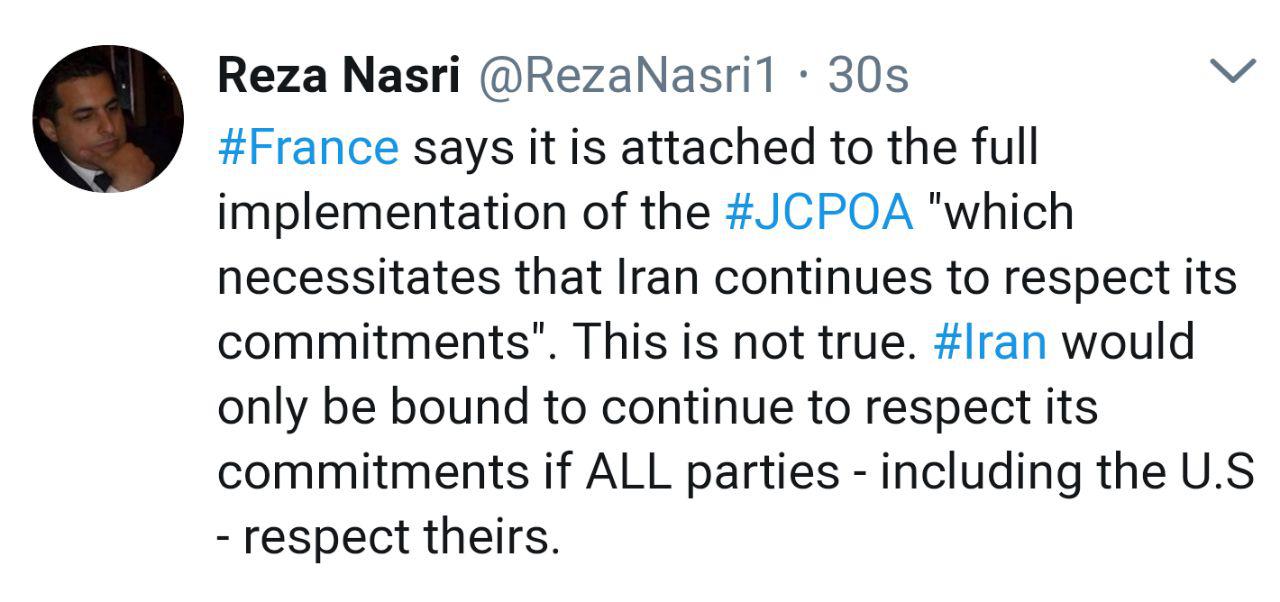 «فرانسه میگوید پاریس به اجرای کامل برجام پایبند است و این ایجاب میکند ایران هم به تعهداتش همچنان پایبند بماند. این ادعای درستی نیست. ایران تنها در صورتی موظف به ادامه اجرای تعهداتش هست که «همه» طرفین - از جمله آمریکا - تعهداتشان را اجرا کنند.»