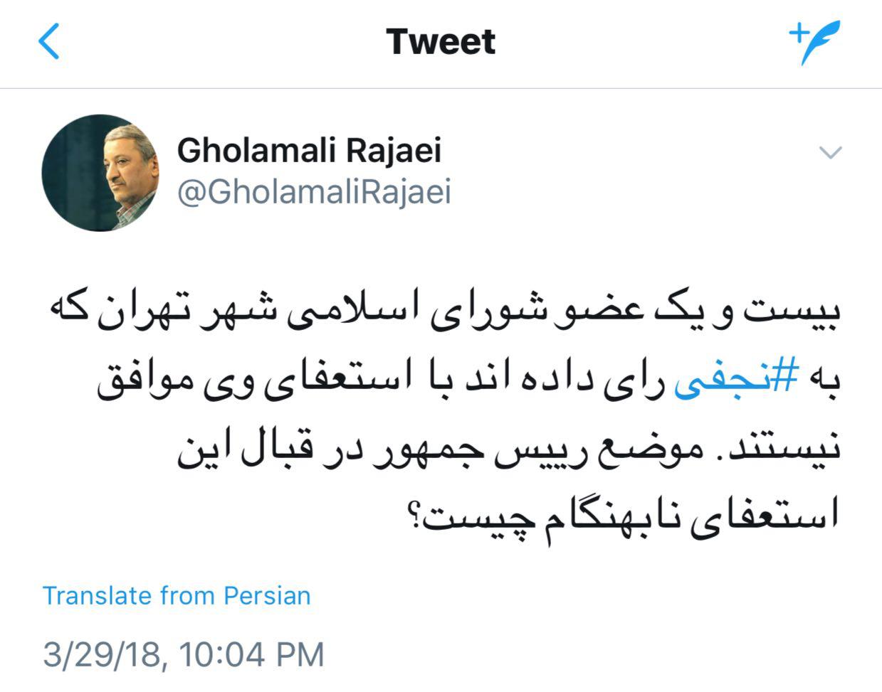 بیست و یک عضو شورای شهر تهران که به نجفی رای داده اند با استعفای وی موافق نیستند، موضع رئیس جمهور در قبال این استعفای نابهنگام چیست؟