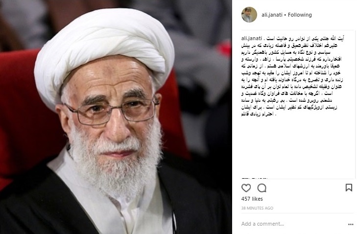 «آیت الله جنتی یکی از نوادر روحانیت است. علیرغم اختلاف نظر عمیق و فاصله زیادی که در بینش سیاسی و نوع نگاه به مسایل کشور با همدیگر داریم؛ افتخار دارم که فرزند شخصیتی پارسا، زاهد، وارسته و عمیقا باورمند به ارزشهای اسلامی هستم. از زمانی که خود را شناخته ام تا امروز ایشان را مقید به تهجد و شب زنده داری و تضرع به درگاه خداوند یافته ام و آنچه را به عنوان وظیفه تشخیص داده با تمام توان بر آن پای فشرده است، اگرچه با مخالفت های فراوان و گاه ضدیت و دشمنی روبرو شده است. بی رغبتی به دنیا و ساده زیستی از ویژگی های کم نظیر ایشان است. برای ایشان احترام زیادی قائلم».