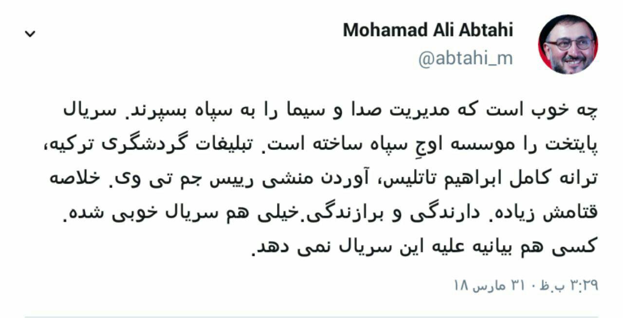 به گزارش جماران، محمد علی ابطحی در صفحه اینستاگرامی خود نوشت: چه خوب است که مدیریت صدا و سیما را به سپاه بسپرند. سریال پایتخت را موسسه اوجِ سپاه ساخته است. تبلیغات گردشگری ترکیه، ترانه کامل ابراهیم تاتلیس، آوردن منشی رییس جم تی وی. خلاصه قتامش زیاده. دارندگی و برازندگی.خیلی هم سریال خوبی شده. کسی هم بیانیه علیه این سریال نمی دهد.