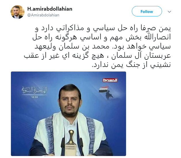 به گزارش جماران؛ حسین امیرعبداللهیان در صفحه شخصی خود در توئیتر نوشت: «یمن صرفا راه حل سیاسی و مذاکراتی دارد و انصارالله بخش مهم و اساسی هر گونه راه حل سیاسی خواهد بود. محمد بن سلمان ولیعهد عربستان آل سلمان، هیچ گزینه‌ای غیر از عقب‌نشینی از جنگ یمن ندارد».