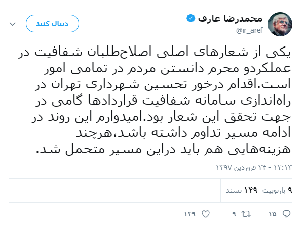به گزارش جماران؛ محمدرضا عارف در صفحه شخصی خود در توییتر نوشت: «یکی از شعارهای اصلی اصلاح طلبان شفافیت در عملکرد و محرم دانستن مردم در تمامی امور است. اقدام در خورتحسین شهرداری تهران در راه اندازی سامانه شفافیت قراردادها گامی در جهت تحقق این شعار بود که امیدوارم این روند در ادامه مسیر تداوم داشته باشد هر چند هزینههایی هم باید در این مسیر متحمل شد.»
