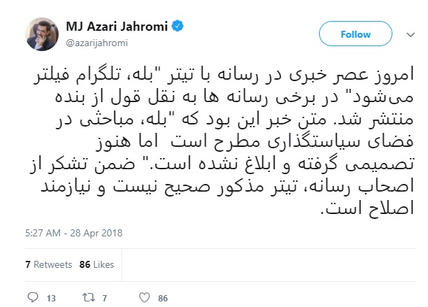 «امروز عصر خبری در رسانه با تیتر "بله، تلگرام فیلتر میشود" در برخی رسانه ها به نقل قول از بنده منتشر شد. متن خبر این بود که "بله، مباحثی در فضای سیاستگذاری مطرح است اما هنوز تصمیمی گرفته و ابلاغ نشده است." ضمن تشکر از اصحاب رسانه، تیتر مذکور صحیح نیست و نیازمند اصلاح است.»