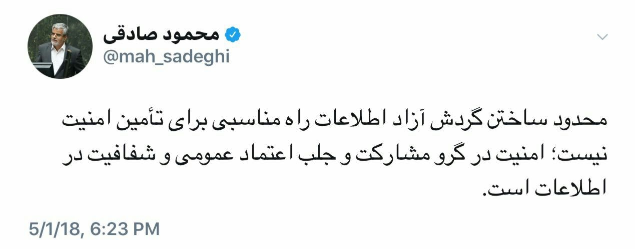به گزارش جماران؛ محمود صادقی، نماینده تهران در مجلس شورای اسلامی، در صفحه توئیتر خود نوشت: «محدود ساختن گردش آزاد اطلاعات راه مناسبی برای تامین امنیت نیست؛ امنیت در گروه مشارکت و جلب اعتماد عمومی و شفافیت در اطلاعات است.»