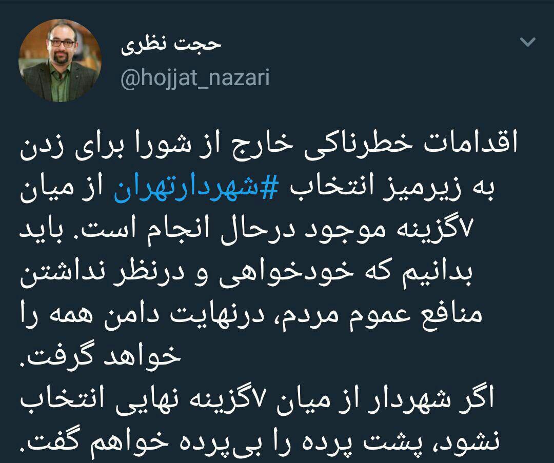 به گزارش جماران؛ حجت نظری عضو شورای شهر تهران در توییتی نوشت: «اقدامات خطرناکی خارج از شورا برای زدن به زیرمیز انتخاب شهردار تهران از میان 7 گزینه موجود در حال انجام است. باید بدانیم که خودخواهی و در نظر نداشتن منافع عموم مردم، در نهایت دامن همه را خواهد گرفت. اگر شهردار از میان 7 گزینه نهایی انتخاب نشود، پشت پرده را بی پرده خواهم گفت».