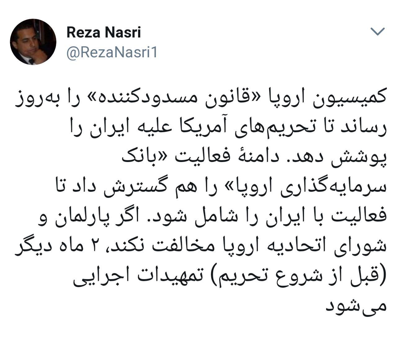«کمیسیون اروپا «قانون مسدودکننده» را به روز رساند تا تحریم های آمریکا علیه ایران را پوشش دهد. دامنه فعالیت «بانک سرمایه گذاری اروپا» را هم گسترش داد تا فعالیت با ایران را شامل شود. اگر پارلمان و شورای اتحادیه اروپا مخالفت نکنند، 2 ماه دیگر (قبل از شروع تحریم) تمهیدات اجرایی می شود.»