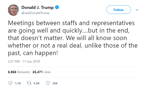 به گزارش جماران؛ دونالد ترامپ، رئیس جمهور آمریکا، در صفحه اش در توئیتر نوشت: «ملاقات‌ها میان هیأت‌ها و نمایندگان به سرعت و به خوبی پیش می‌رود... اما در نهایت مهم این نیست. همه ی ما به زودی خواهیم فهمید که آیا یک توافق که بر خلاف توافق‌های گذشته، واقعی باشد، دست یافتنی هست یا نه.»