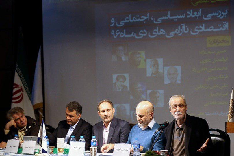 یک سال اخیر جسماش دیگر همراهی نمیکرد اما نگران ایران بود. آخرین بار در دیماه 1396 در نشستی که برای تحلیل اعتراضات خیابانی توسط انجمن جامعهشناسی ایران و انجمن علوم سیاسی برگزار شد، قبل از من سخنرانی کرد (نفر اول سمت راست عکس زیر)، با همه وجود از نگرانیهایش برای ایران گفت و هشدار داد. بیمناک بود، از سرطانی که او را تضعیف میکرد گویی نمیهراسید، شجاعانه با تن نحیفش آمده بود تا از سرطانهای خطرناکتری که بر جان ایران نشستهاند بگوید. سخنش که تمام شد، توان نداشت بالای صحنه بماند، آرام صندلی را ترک گفت و در بین حضار نشست. اما این شش ماه آخر هم دست از تلاش برنداشت، فعالانه اندیشید، نوشت، سخن گفت تا شاید گوش شنوایی پیدا شود.