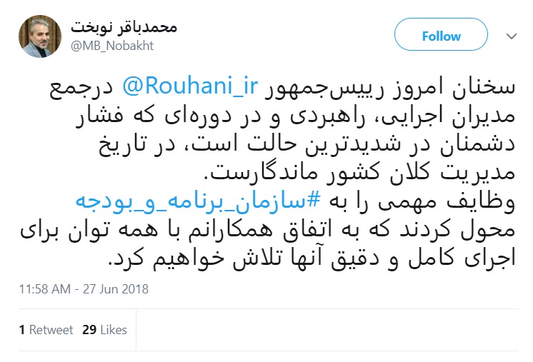 به گزارش جماران؛ محمدباقر نوبخت، سخنگوی دولت و رئیس سازمان برنامه و بودجه کل کشور، در صفحه توئیتر خود نوشت: «سخنان امروز رئیسجمهور در جمع مدیران اجرایی، راهبردی و در دورهای که فشار دشمنان در شدیدترین حالت است، در تاریخ مدیریت کلان کشور ماندگار است.