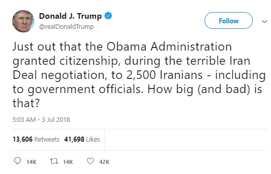 به گزارش جماران؛ دونالد ترامپ رئیس جمهور آمریکا در توئیتی مدعی شد: «تازه مشخص شده که دولت باراک اوباما در جریان توافق وحشتناک هستهای ایران، به 2500 ایرانی - از جمله مقامهای دولتی (ایران)- شهروندی آمریکا را داده است. این مسئله چقدر مهم (و بد) است؟»