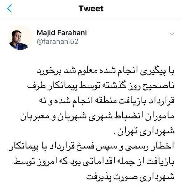 اخطار رسمی و سپس فسخ قرارداد با پیمانکار بازیافت از جمله اقداماتی بود که امروز توسط شهرداری تهران صورت پذیرفت.»