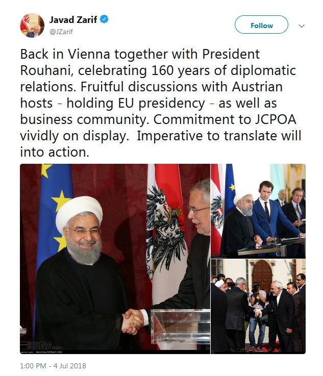 به گزارش جماران؛ محمدجواد ظریف، وزیر امور خارجه کشورمان، در صفحه خود در توئیتر نوشت: «به همراه رئیس جمهور روحانی به وین بازگشته ایم و 160 سال روابط دیپلماتیک را جشن می گیریم. بحث های پرثمری با میزبان اتریشی – رئیس دوره ای اتحادیه اروپا – و همچین جامعه بازرگانی داشتیم. تعهد به برجام به طرز روشنی نمایان است. لازم است که این اراده به عمل درآید.»