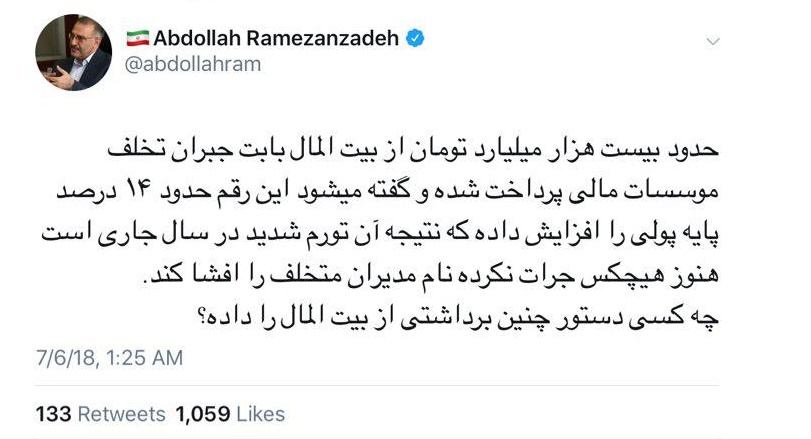 «حدود بیست هزار میلیارد تومان از بیت المال بابت جبران تخلف موسسات مالی پرداخت شده و گفته می شود این رقم حدود 14 درصد پایه پولی را افزایش داده که نتیجه آن تورم شدید در سال جاری است. هنوز هیچکس جرات نکرده نام مدیران متخلف را افشا کند. چه کسی دستور چنین برداشتی از بیت المال را داده؟»