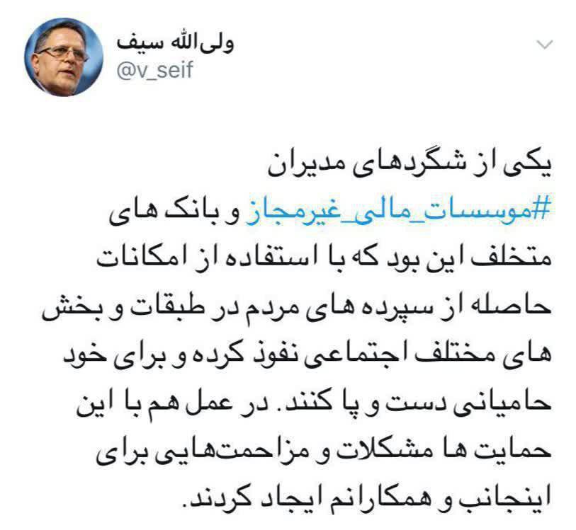 به گزارش جماران؛ ولی الله سیف، رئیس کل بانک مرکزی، در صفحه توئیتر خود نوشت: