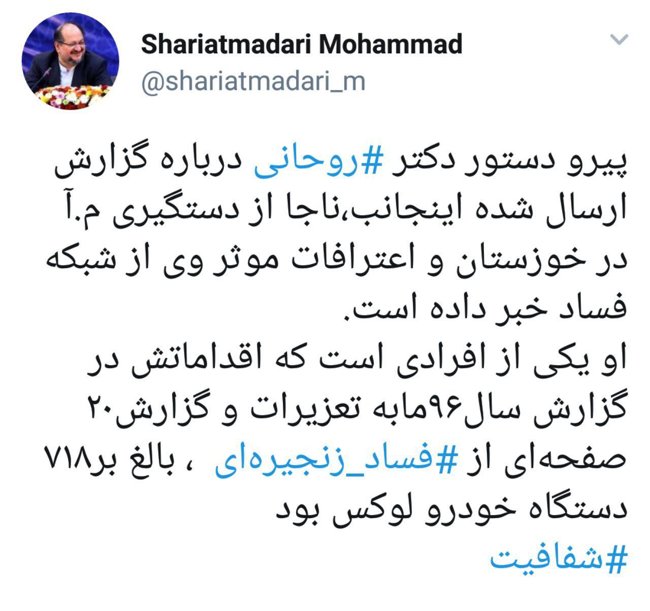 «پیرو دستور دکتر روحانی درباره گزارش ارسال شده اینجانب، ناجا از دستگیری م.آ در خوزستان و اعترافات موثر وی از شبکه فساد خبر داده است. او یکی از افرادی است که اقداماتش در گزارش سال 96 ما به تعزیرات و گزارش 20 صفحه ای از فساد زنجیره ای، بالغ بر 718 دستگاه خودرو لوکس بود.»