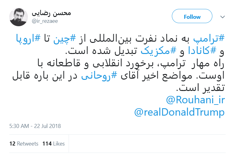 «ترامپ به نماد نفرت بین المللی ازچین تا اروپا و کانادا ومکزیک تبدیل شده است. راه مهار ترامپ، برخورد انقلابی وقاطعانه بااوست. مواضع اخیر آقای روحانی در این باره قابل تقدیر است.»