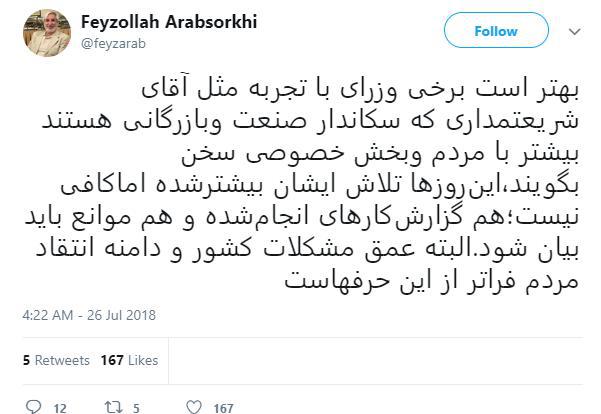 به گزارش جماران؛ فیض الله عرب سرخی، فعال اصلاح طلب، در صفحه توئیتر خود نوشت: