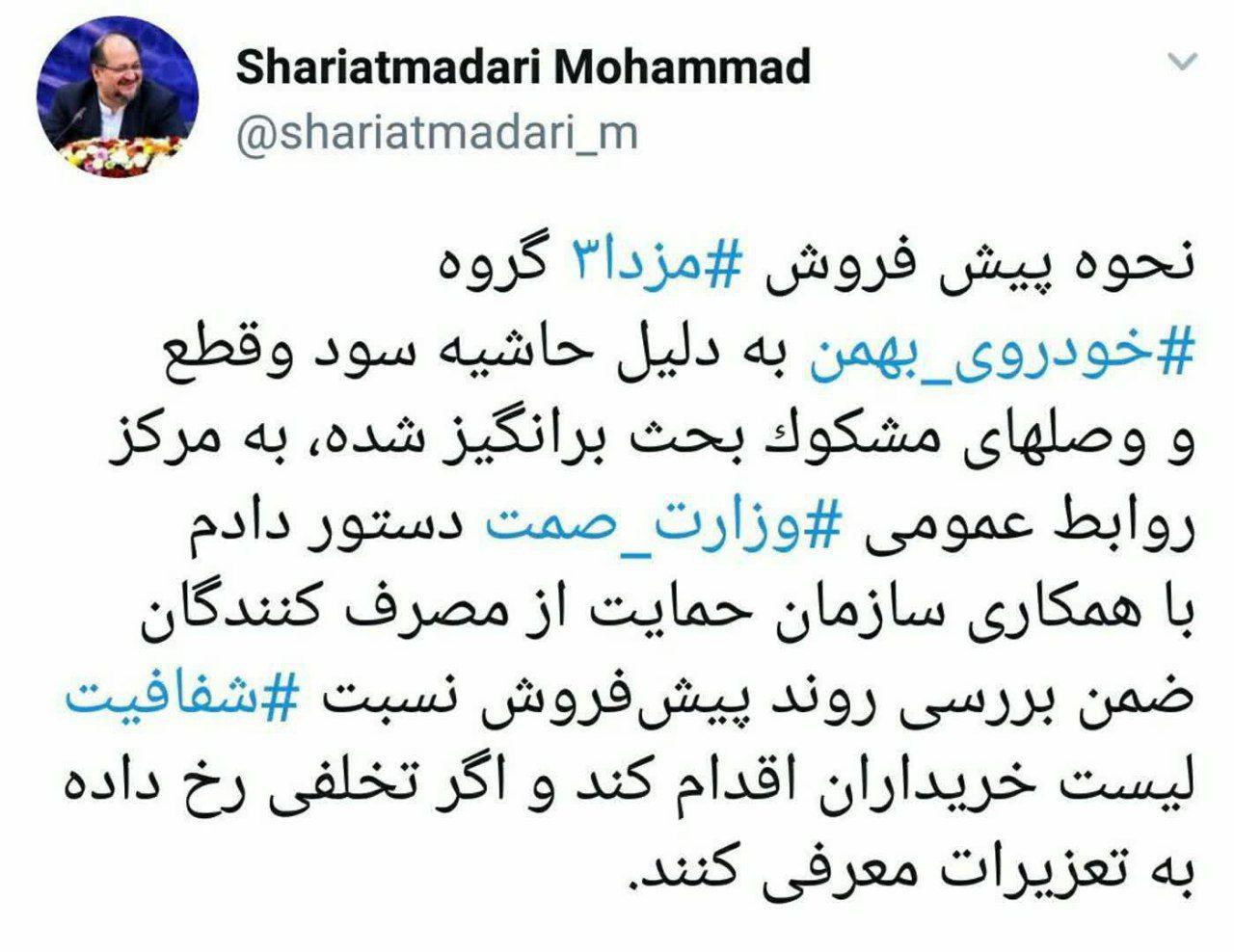 «نحوه پیش فروش مزدا ۳ گروه خودروی بهمن به دلیل حاشیه سود وقطع و وصلهاى مشکوک بحث برانگیز شده، به مرکز روابط عمومی وزارت صمت دستور دادم با همکاری سازمان حمایت از مصرف کنندگان ضمن بررسی روند پیشفروش نسبت شفافیت لیست خریداران اقدام کند و اگر تخلفی رخ داده به تعزیرات معرفی کنند.»