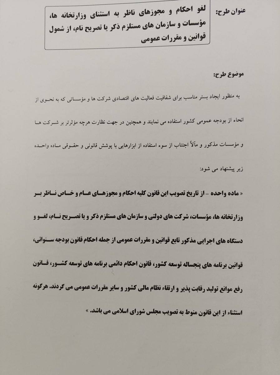 «طرح دو فوریتی فراکسیون شفافسازی برای لغو احکام و مجوزهایی که به وزارتخانهها، مؤسسات و شرکتهای دولتی امکان گریز از قوانین و نظارت دیوان محاسبات را میدهد.»