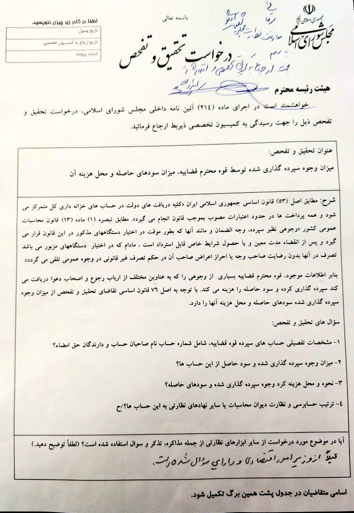 «طرح تحقیق و تفحص از عملکرد حسابهایسپرده قوهقضاییه امروز تقدیم هیأت رییسه مجلس شد.»