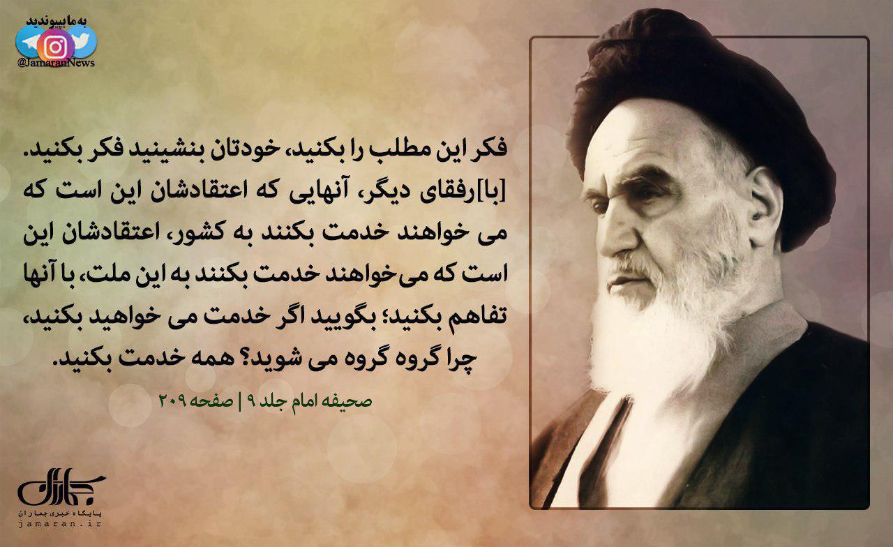 پایگاه خبری جماران؛ امام خمینی(س) می فرمایند: {با} رفقای دیگر، آنهایی که اعتقادشان این است که می خواهند خدمت بکنند به کشور،با آنها تفاهم بکنید؛ بگویید اگر می خواهید خدمت بکنید،چرا گروه گروه می شوید؟ همه خدمت بکنید.