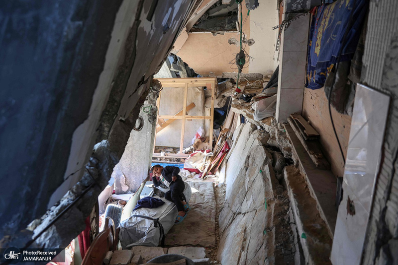 غزه، فلسطین/ یک کودک فلسطینی در حال استراحت در ساختمانی ویران شده در جبالیه