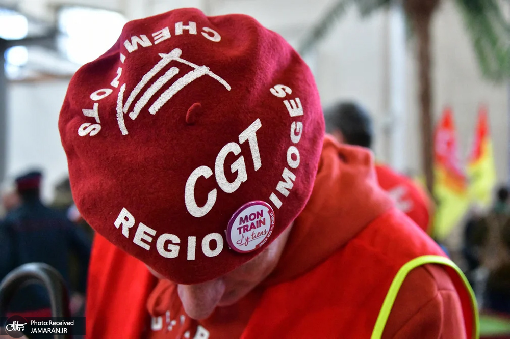 لیموژ، فرانسه/ یکی از اعضای اتحادیه کلاه خود را در جریان اعتراض «قطار خشم» نشان می دهد که در آن صدها کاربر ناراضی راه آهن راهی پاریس شدند