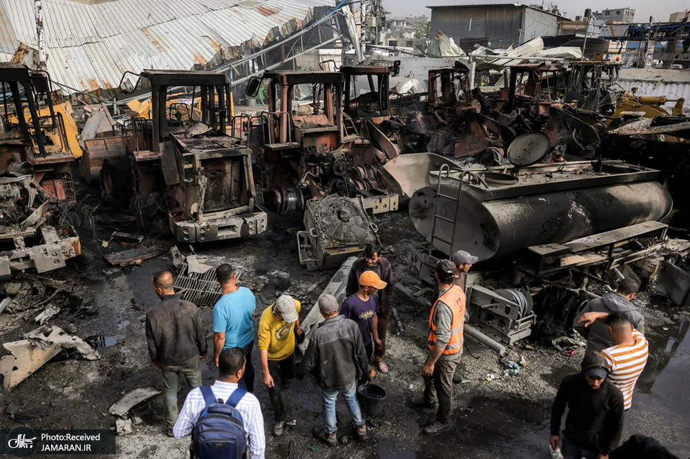 جبالیا، فلسطین/ مردان بولدوزرها و سایر وسایل نقلیه تخریب شده را در گاراژ شهرداری جبالیا که توسط بمباران رژیم صهیونیستی مورد اصابت قرار گرفت، بازرسی می کنند