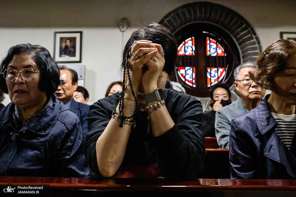 سئول، کره جنوبی/ مردم هنگام ادای احترام در نزدیکی پرتره پاپ فرانسیس که در کلیسای جامع میونگ دونگ نمایش داده شده است، دعا می کنند